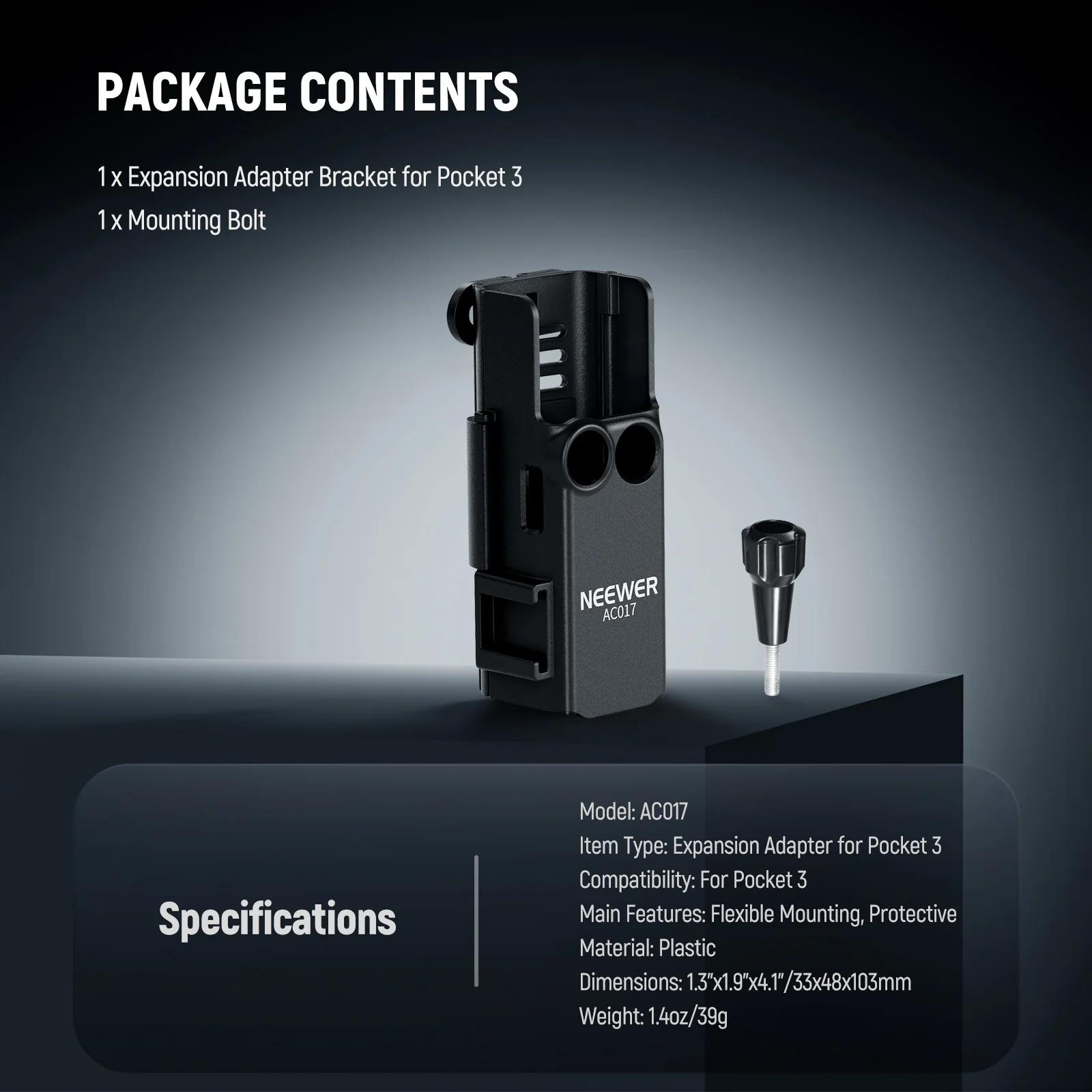 NEEWER BASICS AC017 Extension Adapter Bracket është një aksesor praktik dhe shumë funksional i projektuar posaçërisht për DJI Osmo Pocket 3, që zgjeron ndjeshëm mundësitë e montimit dhe përdorimit gjatë xhirimeve.